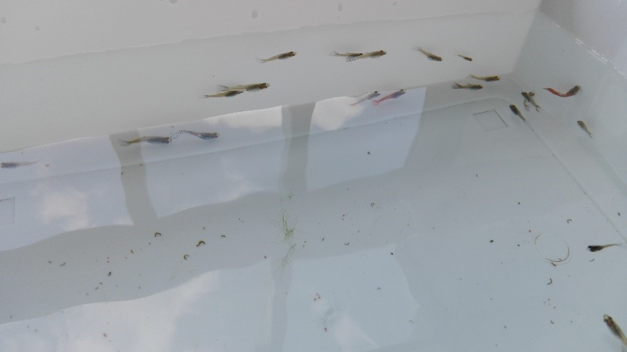 4. 5月以降順調に繁殖し、100尾以上の子供が生まれ、文化祭でも遺伝形質(色合い、尾ひれの形など)を紹介した。そして、11月の生徒生物研究発表会で発表することも視野に入れ、