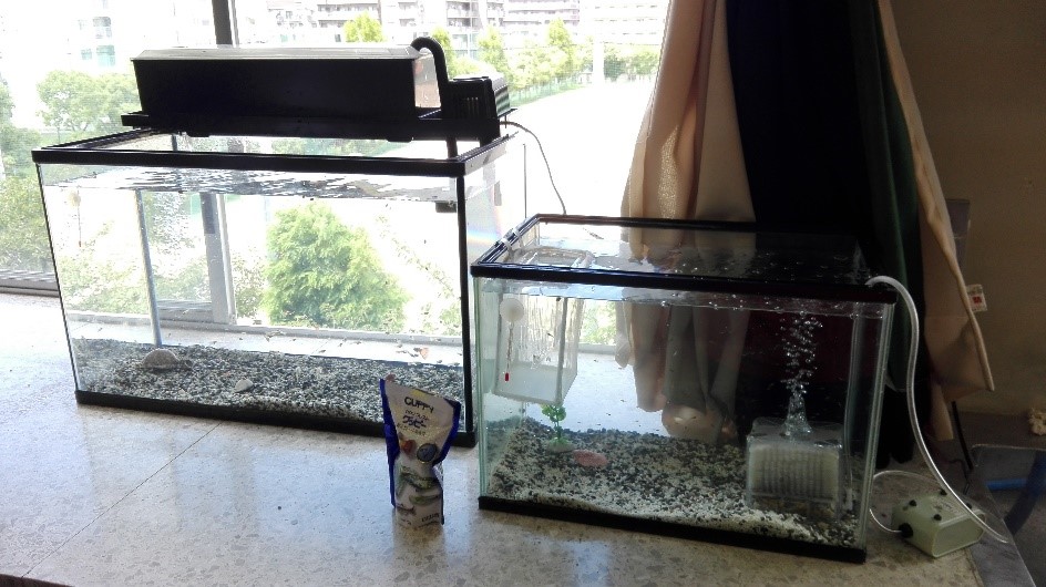 左から @飼育水槽と産卵用水槽 A親のグッピー 尾ひれに色が出ているのが♂