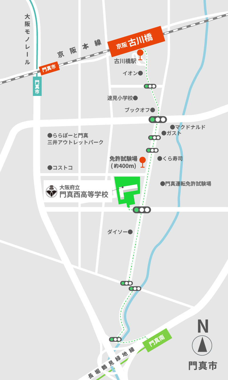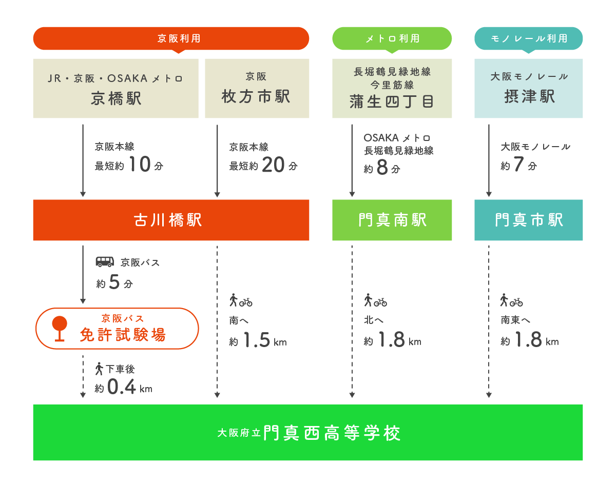 門真西高校は、大阪府門真市にあります。 最寄り駅は京阪本線の古川橋駅で、駅からは自転車やバスで通学が可能です。 京阪沿線からアクセスしやすく、多くの生徒が通いやすい立地にあります。
