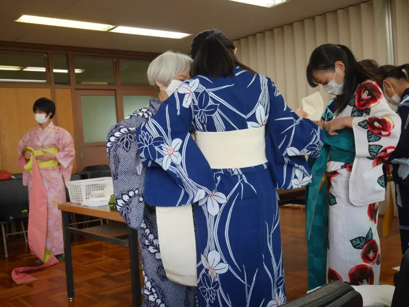 門真西高校では、地域とのつながりを大切にしながら、さまざまな交流イベントを行っています。 毎年恒例の「ゆかた祭り」では、着付けの先生に教わりながら自分で選んだゆかたを着て楽しみます。 また「ピカピカ隊」では、有志の生徒たちが学校周辺の清掃活動を行い、地域の方々と気持ちの良い挨拶を交わしています。