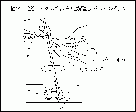 @ 濃い水溶液をうすめるときは、水に試薬を混入させる。濃硫酸の場合この逆の操作をする