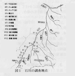筆者は、大阪南部を流れる石川(大和川水系の一支流)に注目し、その自然豊かな山間部の上流から都市部に変わる下流域に至る間の川に溶存している物質の変化を数年にわたって調査してきた。その結果、その変化が上流から下流にかけての河川と流域に住む人間とのかかわりに、流域人口や新興住宅地域、旧村落地域による違い等が大いに関係があることを示してきた1)。その際、いつも天候および水温、気温も同時に測定してきた。今回はこれらの温度の変化が、上流から下流にかけての川の周辺環境の変化とどの様に関連づけられるか考察し、川の水だけを見るのではなく、川を総合的に理解することにつながる教材化への可能性を探ってみた。
