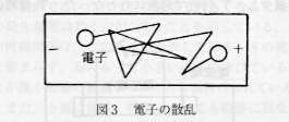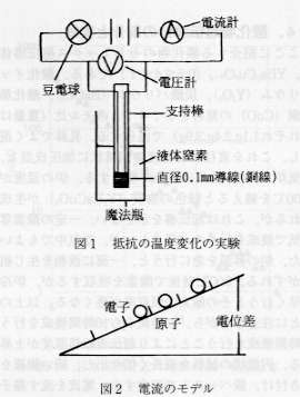 0.1 mm の導線(例,銅線)を角材に 100回程度巻き付けたものを抵抗とし,これに豆電球を直列に乾電池と接続する.巻き線を液体窒素を入れた魔法瓶に浸けて冷却し,電流の変化を観察する.この実験により,電子及び原子の熱運動と電流の関係を想像させ,電流のモデル(図2)を考える.まず,電流を電気を持った粒子の運動と考えてモデルを立てる.そのモデルから,抵抗や発熱の原因,電流と電圧の関係を予想させる.さらに進めて,電流と電圧を測定し,導線の長さ,直径から抵抗率を求め,金属の抵抗の温度依存性をみる.