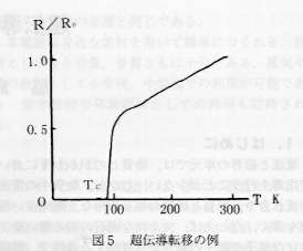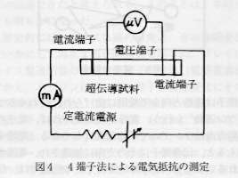 10 mm 程度の円筒状に加圧成型し,電気炉で900℃前後において焼成する.炉の温度が1000℃を越えると緑色の物質(Y2BaCuO5)が生成されるが,これは超伝導を示さない.一定の酸素雰囲気で焼成を行うのが望ましいが,空気中でもよい.また,炉の昇温を急に行うと,一部に液相を生じ組成がずれる.500℃前後で酸素を吸収するが,炉冷を早く行うとその酸素の吸収率が悪くなる.以上のことに注意しながら,3時間から10時間焼成を行う.長時間焼成を行うことにより超伝導転移温度が上昇する.円盤状の試料を細長く切り出し,細い銅線を巻き付け,銀ペーストで固定する.電流を流す端子と電圧を測る端子を図4のように離して付ける(4端子法).電流を1mA程度流し,電圧をマイクロボルトメーターで測定する.XYレコーダーのX端子に試料の面に貼り付けた熱電対の出力をつなぎ,Y端子にマイクロボルトメーターの出力をつなぐ.それぞれの出力の大きさが適当な値となるようにオペアンプで増幅しておく.マイクロボルトメーターの出力の温度依存性を記録計に描かせ,超伝導の転移を観察する.その例を図5に示す.