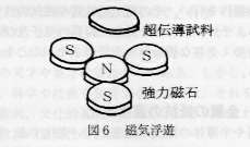 転移温度を表し,今回の測定では80〜90Kの範囲であった.次に,完全反磁性を示すかどうかを調べるために,磁気浮遊の観測を行った.強力磁石を図6のように配置し,液体窒素で冷却した試料をその上に静かに置く.試料が超伝導状態のとき浮遊し,温度が上昇すると常伝導状態にもどり浮かなくなるのを観察した.逆に,液体窒素で冷却した試料の上に薄い円盤状の強力磁石(希土類磁石)を浮かしてみることもできた.このような実験から,超伝導物質の完全反磁性の起こる理由を推測させ,同時に電磁誘導との関わりにも触れることができる.