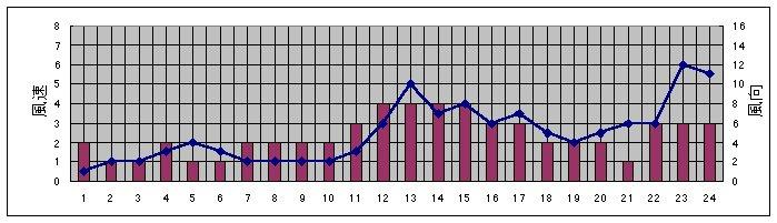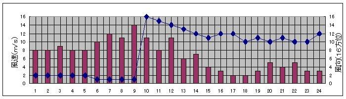 風の記録は棒グラフで風速、折れ線グラフで風向(1:北北東、2:北東、 ・・ 4:東、 ・・ 8:南、 ・・ 12:西、 ・・ 16:北)を表現した