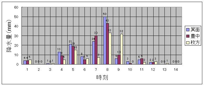 | 最大1時間降水量 | 43.0mm | 13日07時〜08時 | 豊中 |