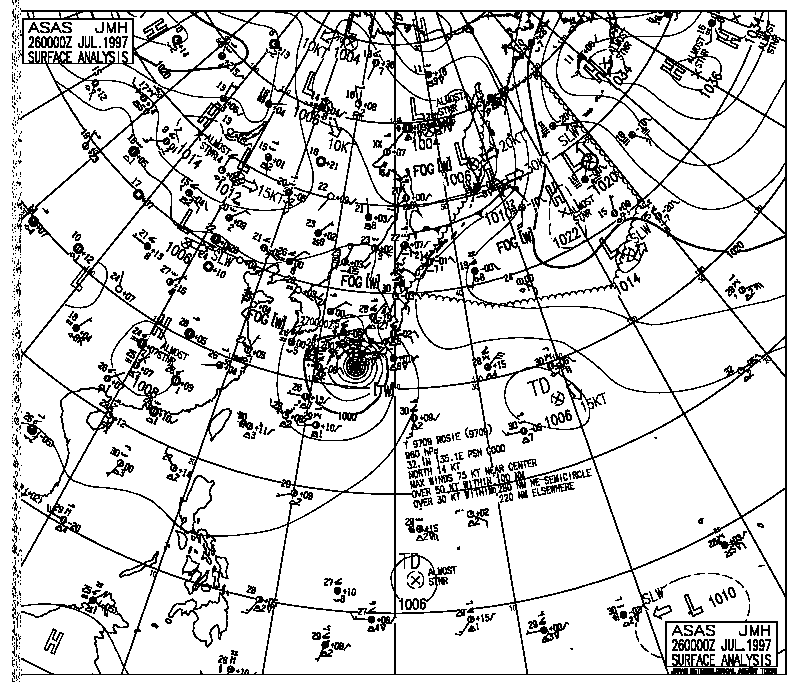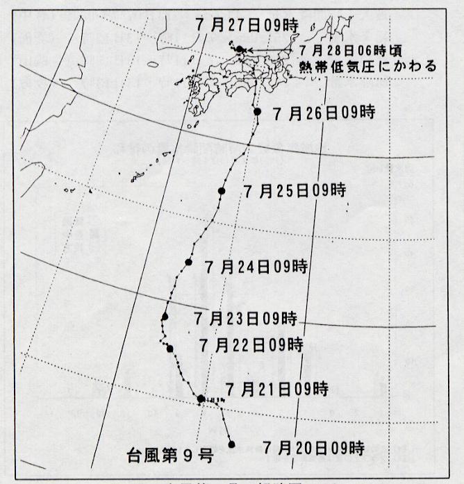 20日フィリピン東海上で発生した台風9709号は、26日17時過ぎに徳島県阿南市に上陸した後、播磨灘へ抜け、21時前に岡山県備前市付近に再上陸した。勢力を弱めながら中国地方を縦断し、27日01時頃に島根県出雲市西方で日本海に抜けた後、山陰沖に停滞し、28日06時頃に熱帯低気圧に変わった。その後若狭湾から近畿地方を通って29日の夜には南海上に抜けた。7月26日06時30分から22時40分まで暴風・波浪警報、18時00分から21時10分まで高潮警報が発表された。