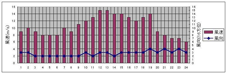 風の記録は棒グラフで風速、折れ線グラフで風向(1:北北東、2:北東、 ・・ 4:東、 ・・ 8:南、 ・・ 12:西、 ・・ 16:北)を表現した