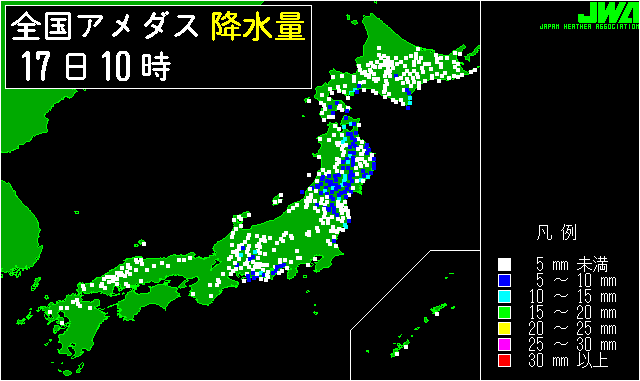 | 最大1時間降水量 | 38.0mm | 17日00時10分〜01時10分 |