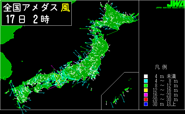 | 最大風速 | ENE 11.0m/s | 16日22時00分 | 豊中 |