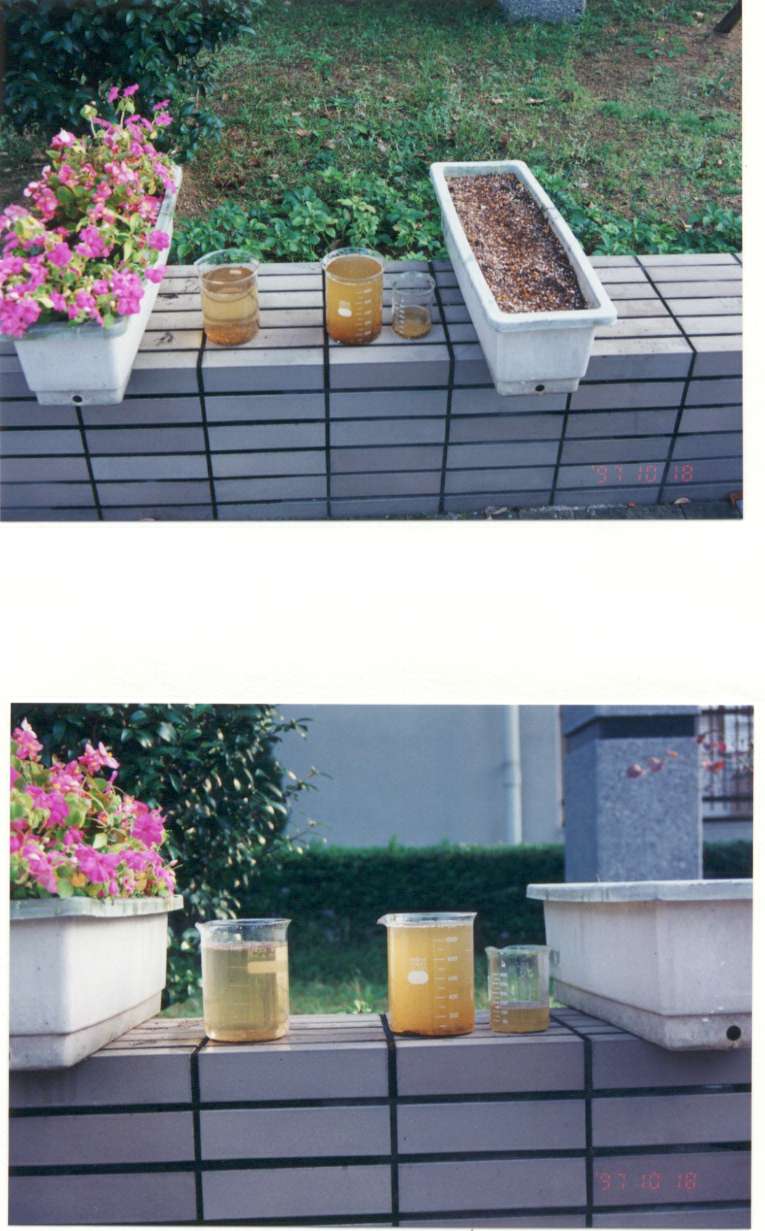 プランターに植物がある場合とない場合とで、水を上から加え、プランターの下から出てくる水の量と濁りを比較する