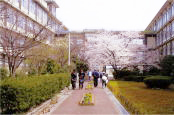 本校自慢の中庭です。春には2本の大きな桜の木が見事に開花します。