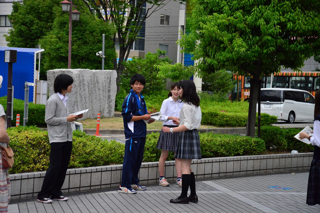| 事前活動 街頭募金 5/28今年の春高生にとっては、初めての街頭募金。初めはなかなか声が出せていませんでした。そんな彼らの感想・報告です。募金の呼び掛けは、最初声が出ない、と言われていましたが、確かにそうでした。初めはなんと言えばいいのかわからず、困惑しましたが、勇気を出して声をかけてみると、貰ってくれる人がいて、嬉しく思いました。 ビラを配っても、もう貰ってくださっていたり、募金箱はどこにあるのか?といった質問がありました。自分がやりたいようにするのではなく、相手の都合を考え、わかりやすくする必要があることがわかりました。 駅を歩いている人を見ると、ご高齢の方が多く、高齢化社会をかんじました。しかし、高齢の方は比較的に僕たちの活動に理解を示してくれ、ビラをうけとってくださったり、話しかけてくれました。若い人にもボランティアに協力してほしいです。 最初は緊張しましたが、やってみると楽しく、あっという間に時間がすぎました。ボランティアに前向きに取り組めそうです。 【1-4 塚越】 阪急茨木市駅で、気仙沼高校野球部を招待するための募金活動とビラ配りをしました。 私には今までにその経験がなく、配るビラの束を受け取っても歩行者の方に声をかけに行くのはおろか、ただビラを手渡すことすら怖くてできません。やっとの思いでビラを差し出してもこちらを見ることすらしてもらえなかったり、いりませんと言われたりと募金活動の洗礼を受け、私の心は折れかけていました。そんなとき、私の前に1人のおじいさんが私の前に自転車を停めました。「募金してきたよ。頑張って。」そう声をかけていただき、心が温まってきました。気にかけて励ましていただけたことはもちろん、震災から4年たった今でもなんらかの形で東北を応援したいと思っている人がいることを身をもって知って、とても嬉しかったのです。初めての経験ばかりでしんどいと思うこともありましたが、それ以上にその嬉しさは大きかったです。 今後も募金活動をしますが、次は、今回一緒に活動した北摂つばさ高校の生徒さん達のように大きな声を出して、少しでも多くの人に興味を持ってもらえるように頑張っていきます。 【1-5 小林】 第1回(5/28)