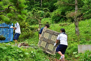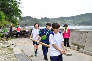 午前中、バスでの移動から、大島へ、フェリーでの移動に。移動中に見えた防災庁舎。その説明から、改めて東日本大震災の津波の恐ろしさを感じた。フェリーを降りると40分の山越え。山を越えて辿り着いた港で、昼食の後、資材運びのお手伝い。山の上の置き場まで木材を運び、並べていく。木材を並べる作業は、現地の方と協力することができた。木材置き場までの道は登り坂だったが、登った先での作業は楽しむことができた。作業の後、牡蠣の養殖場の説明を受けた。牡蠣の養殖がどのように行われているのかわかった。大島から本土に戻り、八背森へ。ホームステイ先ではとても優しくしていただき、食事もとても美味しかった。明日の作業に向けて、しっかりと休息をとりたい。【1年関口】