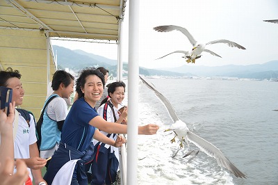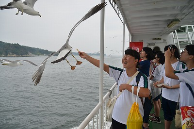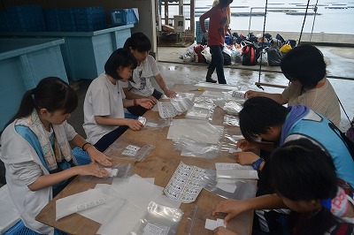 2日目は、遺構として残されている旧道の駅を始めに見学し追悼したあと、フェリーで大島に向かい、カキ養殖場でボランティア作業をしました。