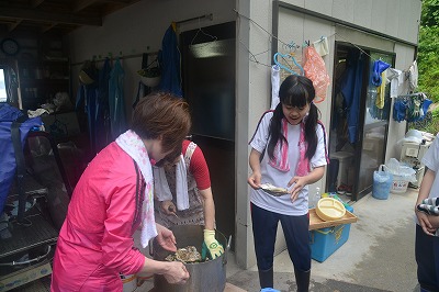 草刈りと、出荷の時に必要なシール貼りの作業をお手伝い。大きく育ったカキを蒸していただいたり、