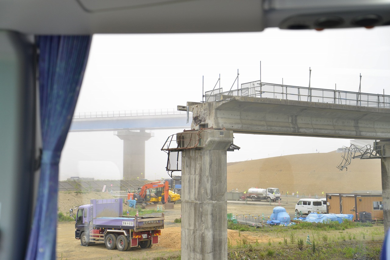 気仙沼市は、現在、道路の整備が行われていて、高速道路はまだ繋がっていない状態である。 また、町村合併で誕生した町なので、土地が広大で、そのため市全体としての復興を果たしきれていない状態である。震災当時から手付かずのままの橋が残されている。これは負の遺産として残していって欲しいと思います。