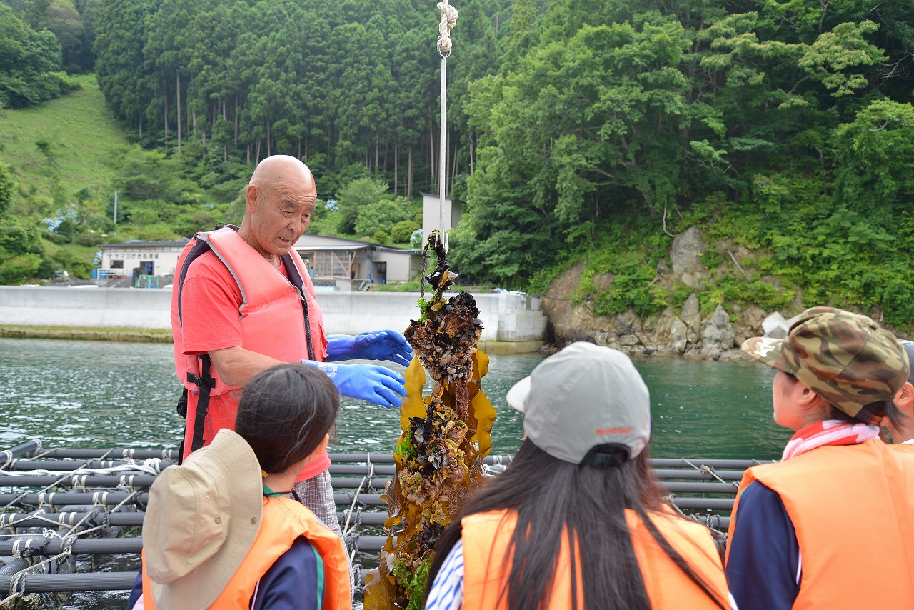 小松さんの漁船に乗って牡蠣の養殖を見に行った。牡蠣には沢山のワカメやウール貝やクラゲが引っ付いていた。それらは、牡蠣の餌であるプランクトンを食べてしまう。それを防ぐために75度のお湯に10秒間つけて駆除するそうだ。しかし、その駆除に船を四隻使っても朝4時から昼の12時までかかるそうです。漁師さんの大変さや重労働であることを再確認した瞬間でした。