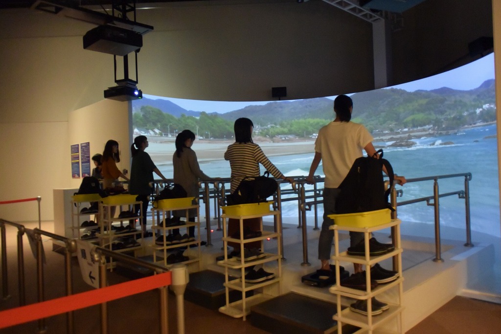 津波体験ブースでは、歩けるほどの津波ということで体験したが、手すりもあり体験だとわかっていたからそれなりに歩けたものの、