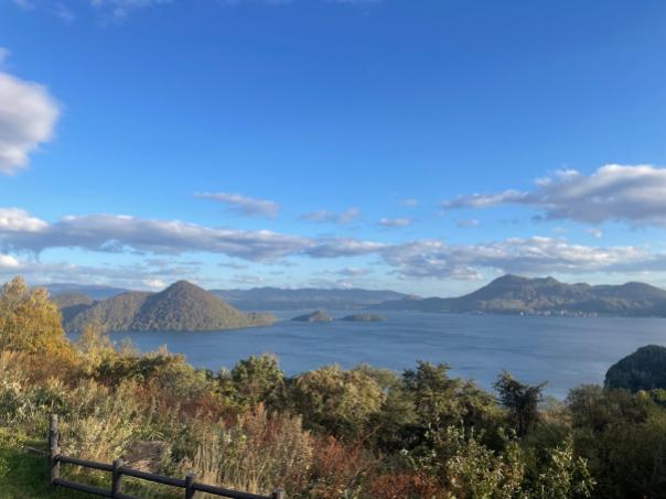 この写真はサイロ展望台から撮った洞爺湖の景色です。洞爺湖の中島は大島、観音島、弁天島、饅頭島の4つから成っています。全て無人島で、モーターボートなどに乗って渡ることができます。紅葉の季節だったので、ボートから見る島は色鮮やかでとても綺麗でした。 |