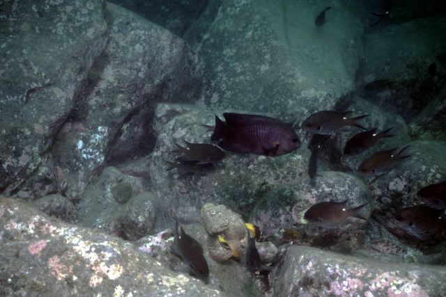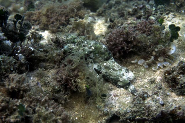 魚が写っていないと思わず、よく見てほしい。中央に転がっている石のように見えるのはオニオコゼである、棘に毒をもつので、刺されると大変であるが、食べると美味しい。石垣島の白保で撮影。
