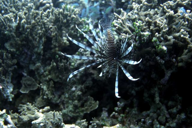 同じカサゴの仲間だが、とても目立つ色彩と形態をしている。この格好でじっと動かないと、サンゴや海藻と間違えて身を隠すために小魚が近寄ってくるのかもしれない。長時間観察すれば、答えがでるであろう。石垣島の白保で撮影。