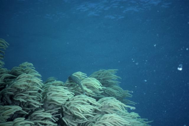 枝状に波打つソフトコーラルの向こうからやってきたのは、筒のような形態の魚である。そっと接近して小魚を飲み込むのに、この細長い体は気付かれにくい、色もかなり自由に変えることができる。沖縄県の瀬底島で撮影。