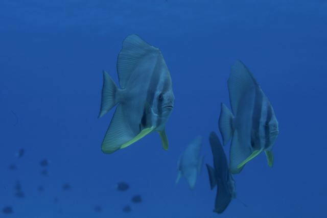 隠れる場所のない水中を悠然と泳いでいる。大きく扁平な体を、飲み込んでしまうにはとても大きな口が必要である。この体型は捕食者に対する適応だと考えられる。未成魚は、水面上にプカプカ浮いて木の葉のように見える。三番目の個体はまだ若く、木の葉に擬態していた当時の色彩が残っている。慶良間諸島の渡嘉敷島で撮影。