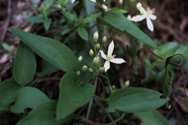 山野の道ばたに普通な細いつる植物、葉腋から円錐花序を出す、花期は7〜9月。