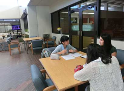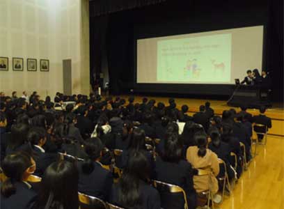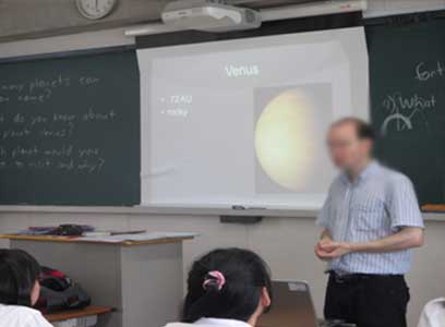 「学内留学」は、実務経験のあるネイティブの講師を招き、ビジネス学・教育学・心理学・天文学・環境学について、大学教養レベルの内容をオールイングリッシュで学ぶ講座です。1・2年生の希望者は年間4回、土曜日の朝から夕方まで英語の講義を聴いたり、英語によるプレゼンテーションを行ったりします。