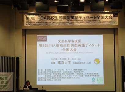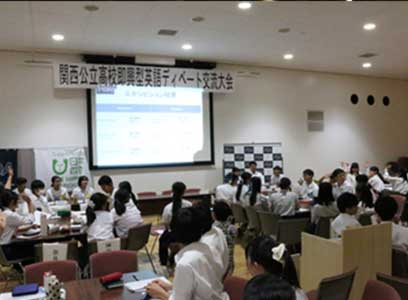英語による即興型ディベートは、英語の瞬発力、論理的思考力、プレゼン力を一体的に鍛える取り組みです。校内での練習の後、近畿圏の公立の進学校と関西交流大会を行い、校内選考で選ばれた代表チームは冬に全国大会に派遣されます。