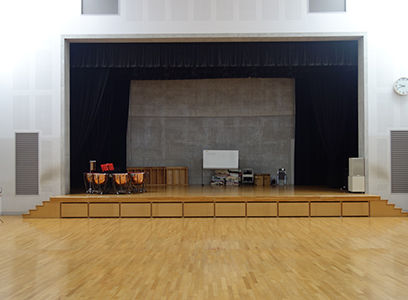 (左)40人全員で使う調理室です。ガスオーブンもあります。(右)学年集会が行われる多目的ホールです。