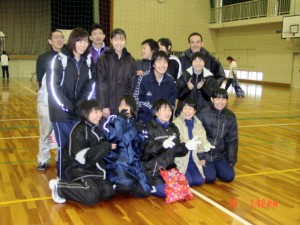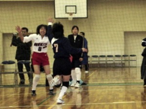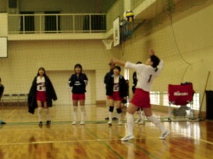 1月19日(日)福井高校で1部の強豪高校、福井高校と対戦しました。かつてない上々の滑り出しで一気に17−9とリードしたものの18−19と逆転されてしまいました。今までならそのまま負けているところでしたが、再逆転する粘りを見せて25−20で1セットを取りました。しかし、2セット目は勝利を意識したのかミスが目立ち、10−25と一方的にとられ、最終セットも7−12まではついていけましたが、その後地力の差が出て15−25で取られ、1回戦で敗退しました。しかし、随所にこの半年間大懸コーチに学んできた成果が現れたプレーが見られました。
