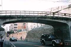 橋の下は川が流れているのではなく、自動車が走っています。この橋は、文録の堤を削って造った陸橋なのです。その断面を見ると文録堤のがっちりした構造がわかります。堤の上にも自動車が走り、びくともしないのは当時の技術の高さを物語っています。守口のシンボルともいえる橋です。