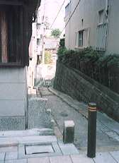 文録堤の上の京街道を歩いていると、「右ならのざきみち」とある見落としそうな小さな道しるべがあります。この坂を下ると難宗寺を経て旧奈良街道へと通じています。環豪集落の特徴をとどめる来迎町とともに歴史を偲ぶにはうってつけの場所です。