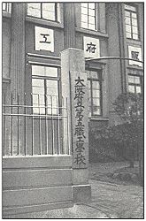 | 昭和11(1936) 3. 2 大阪府立第五職工学校設置認可 (第一化学工業科 第二化学工業科、金属工業科、化学機械科) 昭和11(1936) 4.14 大阪府工業奨励館(大阪市西区江之子島)にて 開校式、第1期生の入学式。 昭和11(1936)10.19 堺市耳原町1200番地において地鎮祭施行。 昭和12(1937) 3.17 大阪府立堺職工学校と改称。 昭和12(1937) 4. 7 堺市耳原町1200番地(現在地)へ移転。 昭和15(1940) 3.18 電気化学工業科設置。 昭和16(1941) 9. 1 大阪府立堺工業学校と改称。 昭和18(1943) 4. 1 学科統合と学科名改称(金属工業科そのまま) ○第一化学工業科&第二化学工業科 → 工業化学科 ○化学機械科 → 機械科 ○電気化学科 → 電気科 ○燃料科設置(昭和21年度まで募集)。 昭和19(1944) 4. 1 電気通信科設置(昭和21年4月電気科統合)。 昭和19(1944) 7. 9 戦災により木造校舎1棟全焼。 昭和20(1945) 8.15 終戦。 | ||