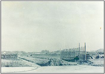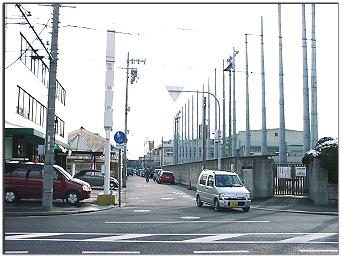 | 昭和11(1936)年頃の写真。写真左の歩道とおぼしき位 置から想像するに、現在のバイクショップ「NANKAI」あたり の風景か。収穫を終えた稲が逆さにつるされている。 第五職工学校の建設予定地は堺市の他にもいくつかあっ たが、30年余にわたって学校誘致を計画していた堺市が、 もっとも熱心で積極的であった。当初堺市が示した土地は、 ちょうど今の旭中学校あたりで、大阪府はそれに対して産業 道路(通称13号線)沿いを要求したといわれる。 戦後昭和40年代に入り、13号線に面していた府工は自動 車騒音に悩まされ、それが現校舎への建て替え工事につな がる。もし最初の計画通りの場所で建設されていれば、もう 少し建て替えの時期が遅れていたのかもしれない。一度でも いいから旧校舎を見たかった。 |