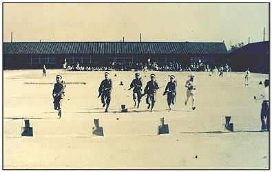 | 同じく昭和15年11月3日体育大会の風景。 銃剣道部の主将(5期生・昭和18年卒)は、銃剣道に ついて会報で以下のように書いている。 「明治37、8年日露戦争において白兵戦の威力、殊(こ と)に銃剣突撃の効果は判然としその道の研究は次第 に重要視され更に今次大東亜戦争(=日中戦争、太平 洋戦争をさす)に至っては幾多の生々しい体験を得て、 銃剣道こそは国民必須の武道であると大いに叫ばれる に至ったのである」 先端に剣の付いた模擬銃を持ち、敵の顔をかいた人 形めがけて突撃しているところ。全員大声で雄叫びを あげながら走っている。日本の得意とする白兵戦であ ったが、日中戦争や太平洋戦争では通用するはずも なく、多くの兵士達が写真のような姿を最後に玉砕して いったと思われる。 |