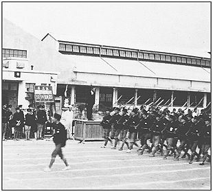 | 昭和14(1939)年11月3日の第2回体育大会。 2ヶ月前の9月1日、欧州では日本の同盟国ドイツがポ ーランドに侵攻して第2次世界大戦が勃発する。 写真は体育大会最後を飾る全学年による分列行進。 学年順に入場し、1科20人が2列になっている。先端に 刀を着けた模擬銃を持つ、当時最高学年の4年生(現在 の高1)。先頭の掛け声で全員が「かしら右」となり、整然 と行進している。 前列一番向こうの生徒は、「かしら右」をせず前を向い ているが、進行方向を真っ直ぐ見て列が曲がらないよう に調整する役目を担当している。 |