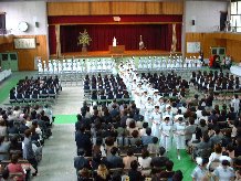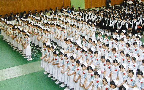 戴帽式は、ナイチンゲールの貢献的な看護の 精神と、ナースキャップの持つ責任の重さを心 に銘記し、看護実習につくための区切りの式と して行われるようになりました。 白菊高校は残念ながら平成16年3月末をもって 閉校となります。平成14年5月11日に行われた 本年度の戴帽式が最後の戴帽式となりました。 | |