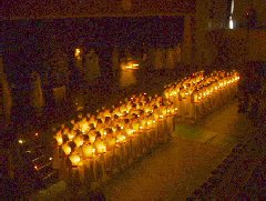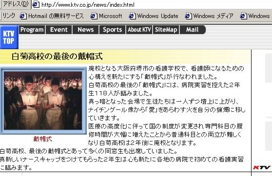 本校の戴帽式は、看護の先輩である先生方から、 一人一人ナースキャップを頭にのせてもらい、 ナイチンゲール像の『親火』から各自のローソ クに『愛の灯』を受け継ぎます。そして、ナイ チンゲール賛歌を斉唱し、来賓、先輩、後輩の 前で、誓詞を延べ、看護の実習に専念する決意 を新たにします。 平成14年度の白菊高校の戴帽式も、テレビや 新聞、Webページで報道されました。 |