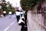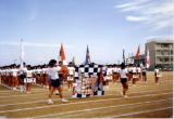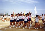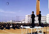 体育祭の入場行進 応援旗を持っての行進です。 現在は応援旗はなくなり、文化祭での垂れ幕へと変化しました。 |