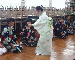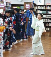 7月21日から出発するオーストラリアのトゥーンバ高校への短期留学の留学生に対する 研修が行われています。英会話の練習やオーストラリアについて、ホームステイでの注意事項 などとともに13日には向こうでのパーティーで披露する踊りの練習が、講師の先生を招いて、 行われました。浴衣姿に着替え初めはとまどいながらも、講師の先生の熱心な指導の下、 次第に形になってきました。向こうでは、立派な踊りを期待しています。