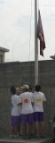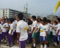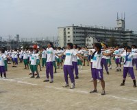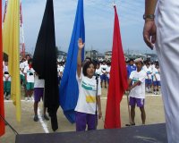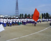 青空の下、選手入場に続き、校旗掲揚・学校長挨拶・PTA会長挨拶・選手宣誓・ エール交換・準備体操と行われました。
