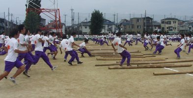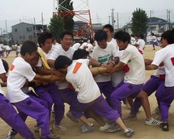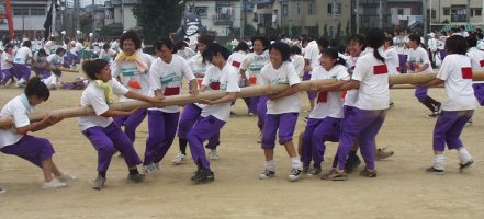 グランドにおいてある棒をできるだけ自陣に引き入れる棒引き。 3年生全員による男女1レースずつ。