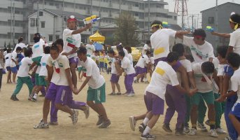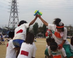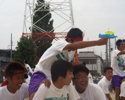 トラック内で騎馬を作り、上の人は的をつけたはちまきをつける。上の人が 水鉄砲で撃ち合い、的を破った騎馬を勝ちとする。男女1試合ずつ。